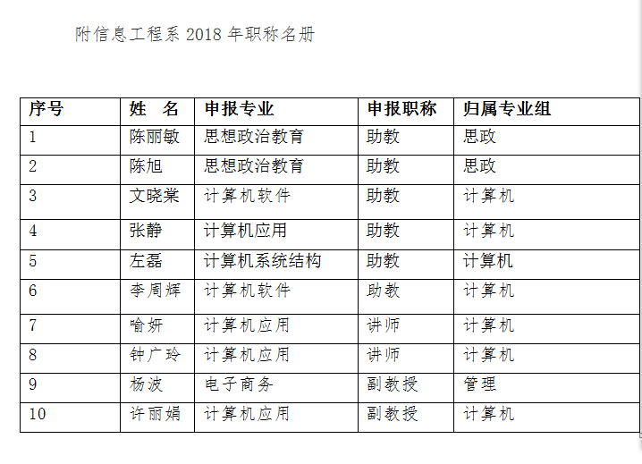根据live28365华商学院有关文件规定,2018年5月9日经信息工程系职称评审小组工作会议审核,现将息工程系申报高等学校教师职称人员情况进行网上公示,同时在信息工程系专职教师QQ群及微信群进行公示。公示时间从2018年5月10日至2018年5月14日止。若对以申报人员有异议的,可以到信息工程系办公室查阅申报材料。另外,请以书面形式向信息工程系反映情况。反映情况时要自报或签署真实姓名,要有具体事实;不报或不签署真实姓名的,以及不提供具体事实材料的,不予受理。